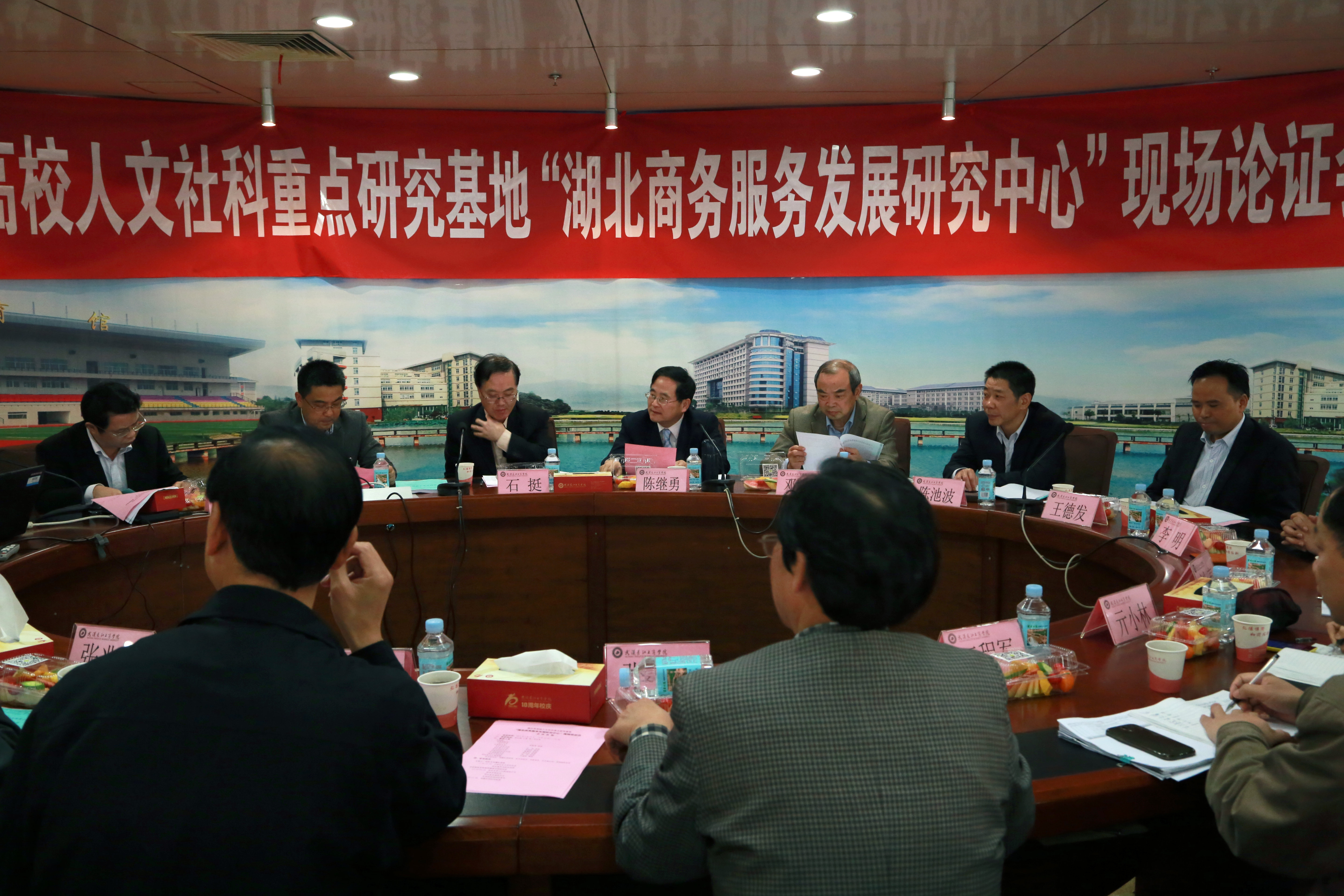 来自武汉大学,华中科技大学,华中师范大学、武汉理工大学、中南财经政法大学,中南民族大学和湖北工业大学高校的专家组通过听取汇报、现场考察、质询答辩和评议等环节,由专家组组长陈继勇教授宣读:“湖北省商务服务发展研究中心”研究方向确定合理,建设目标明确,建设方案可行,建议学校要突出研究基地的平台作用和整合功能,能有效地为湖北商务服务发展战略和政策研究提供支持;同时,专家组建议中心立项后要制定发展规划,包括中心的近期目标,中期目标和长期目标并分步实施;加强中心建设的同时把握研究重点、突出研究特色,注重品牌建设。最后专家组一致认为“湖北商务服务发展研究中心”基地符合湖北省高校人文社科重点研究基地建设要求,同意立项建设的论证结论。