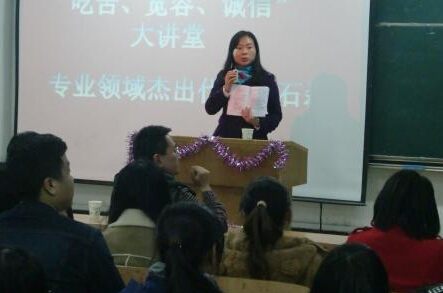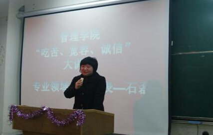 管理学院分团委宣传部讯 (通讯员:叶子英)11月25日晚七点,管理学院在综合楼307组织开展了“吃苦,宽容,诚信”大讲堂第四讲。中国电信湖北财务共享服务中心主任石磊女士作为邀请嘉宾为同学们带来了此次讲座。管理学院常务副院长李明、党总支书记吴茜、副书记陈玲、院长助理陈振祥、会计系主任聂新田、分团委书记汪燕以及部分辅导员聆听了此次讲座。