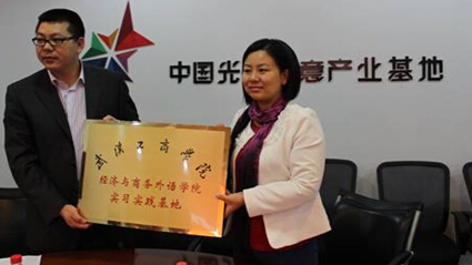 (经济与商务外语学院讯)2014年10月31日上午10点,我院与中国光谷创意产业基地共建的实习基地挂牌仪式在中国光谷创意产业基地大厦B座8楼会议室隆重举行。我院常务副院长张晓骏、党总支副书记胡航、文化产业管理系专业负责人刘连银、系主任周国洋及部分实习学生和中国光谷创意产业基地的领导及工作人员参加了这次挂牌仪式。