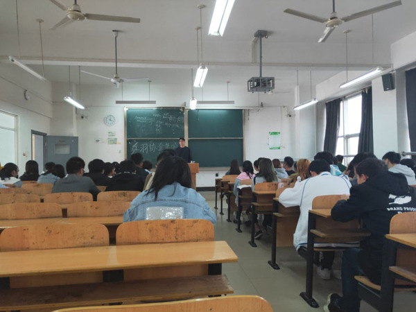 例会开始前由秘书部负责全体成员点名签到。然后进行第一项,乒羽协会会长刘加隆进行讲话:上月社团评比结果已出来,本社团排名第六。希望各部门再接再厉,各部员积极参与社团任务,协会的目标是争取社团第一!部长的话语中充满了信心与责任,并鼓舞着在座的每位部员。