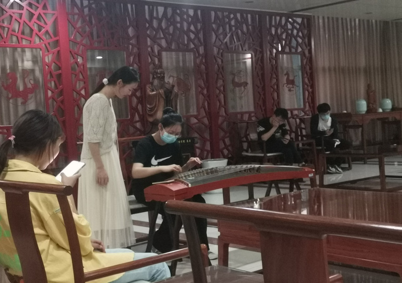 小课最后,仍有许多社员跃跃欲试,主讲人胡奥提出下课后,希望尝试的社员可以上前共同学习,相互讨论古筝指法技巧。