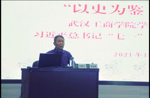 14日下午2:30分,参加讲座的同学已经陆续就位等候,在主持人谢惠卉主持下,讲座拉开了帷幕。李纪明教授走上讲台,对“七一”精神讲座展开了介绍,本次讲座主要围绕:一点认识,二点体会,三点建议,这三个议题进行了展开。首先一点认识,李教授认为“七一”精神讲话是在“两个一百年”历史交汇点和世界百年大变局中开展的,可以说“七一”精神讲座是当代历史的重要转折点,是以前与未来的分界线,同样也是对全党的进军号,未来该当如何走我们得思考和努力。