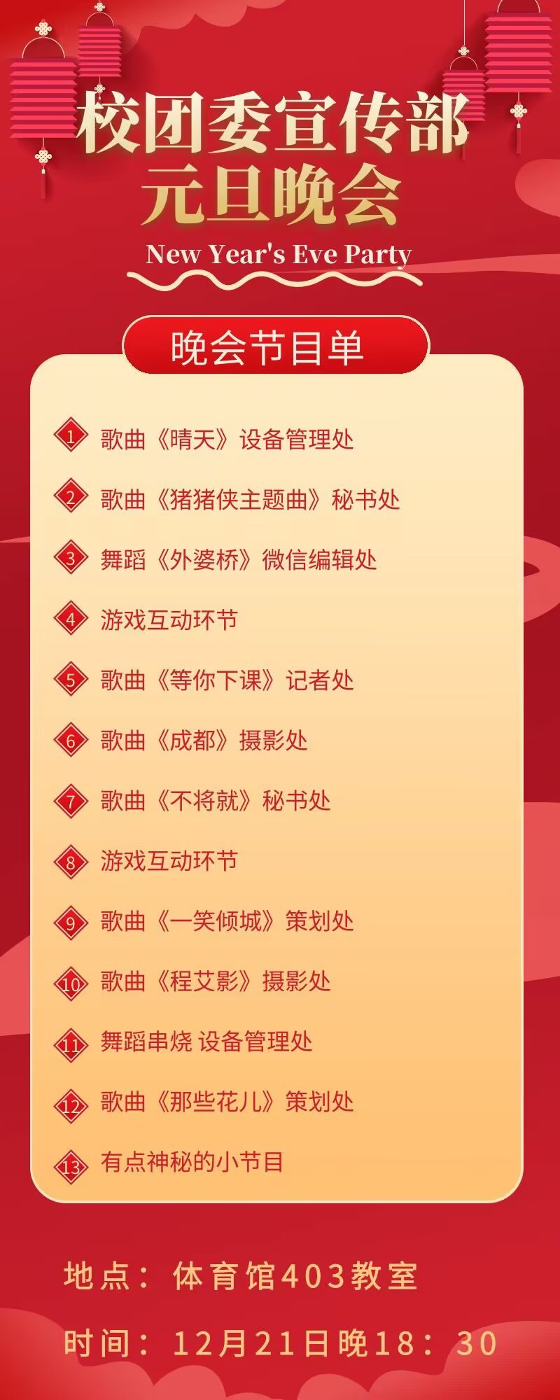 欢迎全体师生届时踊跃参与,让我们相聚一堂,共迎新年,在欢声笑语中开启充满希望的新一年!