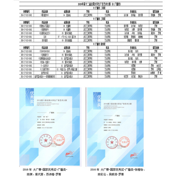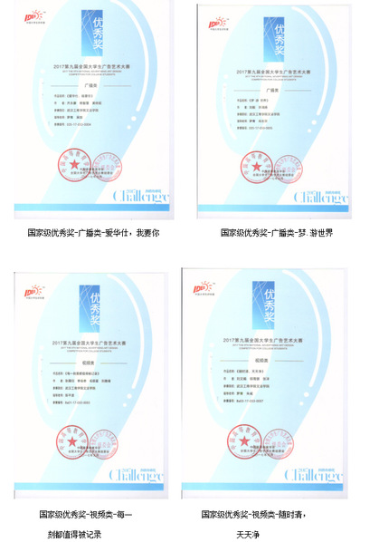 2017年,在第九届全国大学生广告艺术大赛上,我系学生获得国家优秀奖4个;获得省级二等奖6个、省级三等奖4个、省级优秀奖5个。
