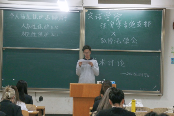 文法新媒体中心讯(记者:连玉欣)11月18—19日,为期两天的“学术探讨研究会”预赛在综合楼306教室顺利开展。此次主题活动由米乐mile官方网站文法学院法学学生党支部以及弘博法学会联合举办。活动旨在引导我校法学专业学生养成从法律角度分析问题,培养法治理念和法律