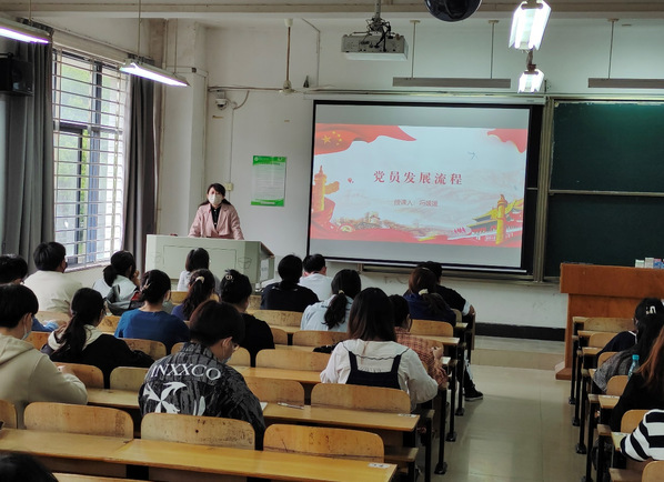 冯媛媛老师围绕“申请入党”、“入党积极分子的确定和培养教育考察”、“发展对象的确定和考察”、“预备党员的接收”和“预备党员的考察和转正”五项党员发展流程内容展开介绍。