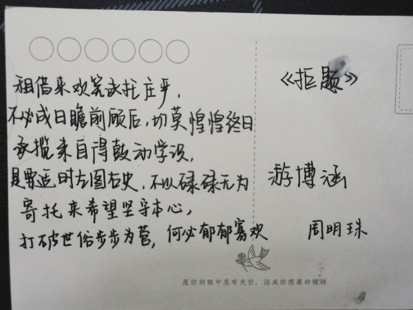 本次活动共有十三位同学参加,写诗活动分为两轮,第一轮每位同学各自写出自己的诗句并发送给负责人进行代写,第二轮参与同学前往指定地点进行交换诗的抽取并进行续写。每位同学既是出题人也是答题人。