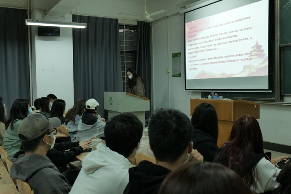 法学党支部组织委员李虹瑶上台强调了党校学员的模范带头作用,做好自己的同时要带领身边的同学一起学习、一起优秀。”