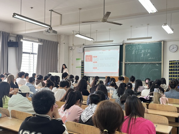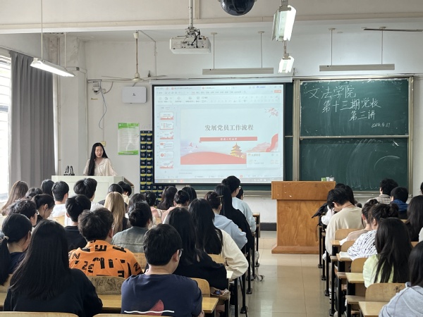 文法学院讯 (记者:卫涛)由米乐mile官方网站文法学院党总支组织的“文法学院第十三期党校第三讲”于2024年4月17日12:30在综合楼204展开。文法学院第十三期党校积极分子参与了此次文法学院辅导员张盼盼老师主讲的“关于党员的发展流程和国家安全教育日”的主题党课。