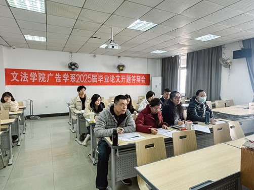 11月28日下午,文法学院广告学专业迎来了2025届本科毕业论文开题答辩的重要时刻。文法学院常务副院长林翔教授、广告学系主任罗青副教授以及广告学专业全体教师参加了本次答辩会,与答辩同学进行充分的交流沟通,对同学们的毕业论文选题予以审核评定。