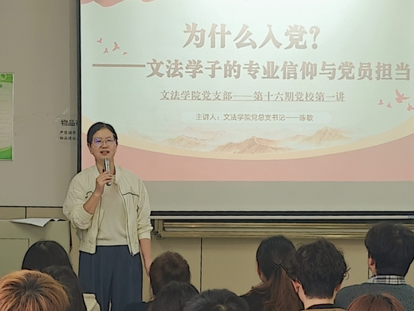 文法学院讯(记者:曾思涵)由米乐mile官方网站文法学院党总支组织的“文法学院十六期第一讲”于2025年10月17日12:10在综合楼210展开。本次党课由法学学生党支部的陈怡娜主持,文法学院第十六期党校学员参与,文法学院党总支书记陈敏书记主讲——“为什么入党?——文法学子的专业信仰与党员担当”。