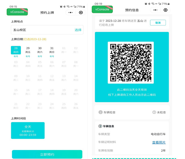 第五步:预约上牌,选择校区后选择合适的日期及时段点击立即预约,会出现预约码,到时现场办理上牌工作时经核对证件后出示此二维码绑定车牌,即可办理成功。