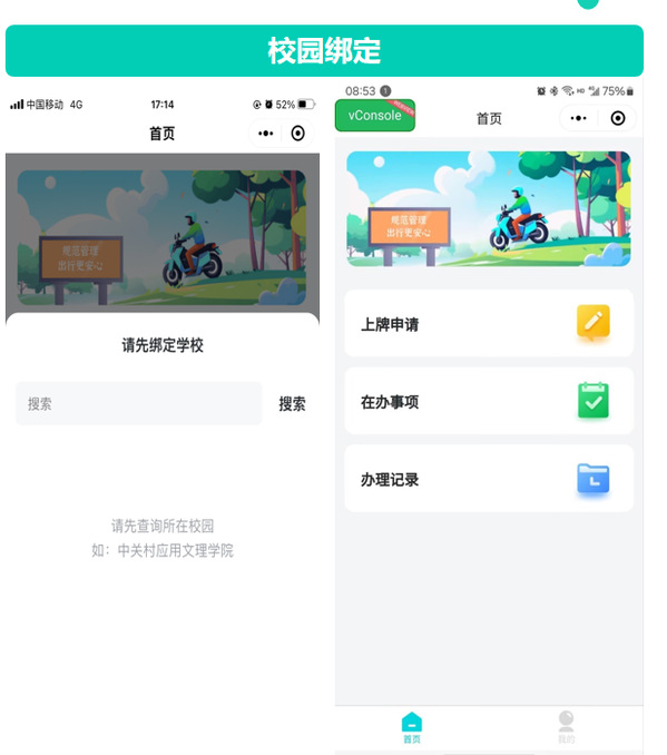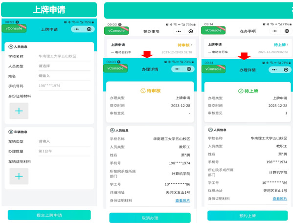 第四步:填写相关信息以及上传身份资料及车辆证明材料即可完成校园牌照申请,返回上一步点击在办事项可查询申请是否审核成功。审核完成后下方会显示预约上牌。