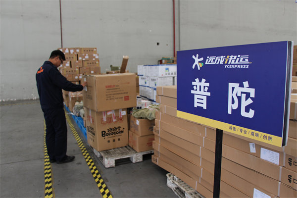图为远成上海实习生廖博力正在检查货物 摄影:林倩