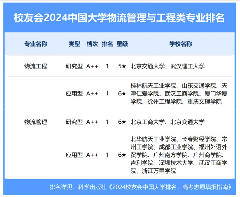 榜单显示,针对研究型专业, 在校友会2024中国大学采购管理专业排名(研究型)中,北京物资学院荣得2024中国四星级专业(4★),位列世界知名、中国高水平专业行列,问鼎冠军。在校友会2024中国大学供应链管理专业排名(研究型)中,中央财经大学荣获2024中国四星级专业(4★),挺进世界知名、中国高水平专业行列,雄居冠军。在校友会2024中国大学物流工程专业排名(研究型)中,武汉理工大学、北京交通大学获得2024中国五星级专业(5★),位列世界知名专业、中国一流专业行列,雄居第一。在校友会2024中国大学物流管理专业排名(研究型)中,北京工商大学、北京交通大学荣得2024中国六星级专业(6★),入围世界高水平专业、中国顶尖专业行列,荣登第一。