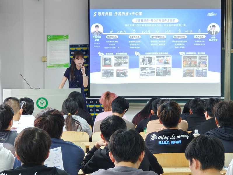随后,校招负责人吴祎从集团发展历程、培养计划、岗位内容、面试流程四个维度,为学生们全面介绍了顺丰集团的基本情况。针对学生们普遍关心的职业发展问题,宣讲人不仅详细讲解了应聘岗位的报名方式、面试流程以及薪酬福利,还特别介绍了吴家山“智慧中转场运营”项目。该项目在智能分拣、自动化仓储、绿色物流等领域创新应用成果显著,吴家山中转场作为顺丰华中区域核心枢纽,已实现90%包裹自动化分拣。实习生将有机会深度参与该项目,在真实的业务场景中掌握物流自动化与智能化技术,为个人职业发展增添核心竞争力。宣讲人热情地向广大学生发出邀请,欢迎他们到吴家山场站实习。