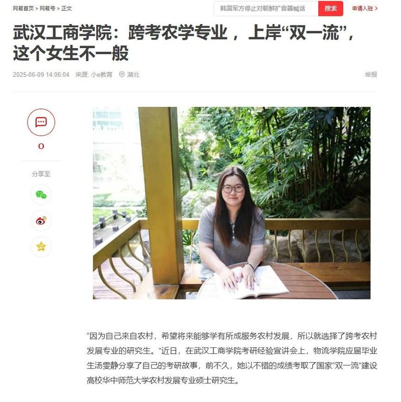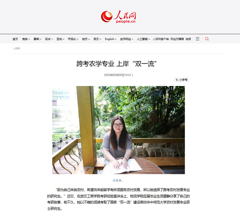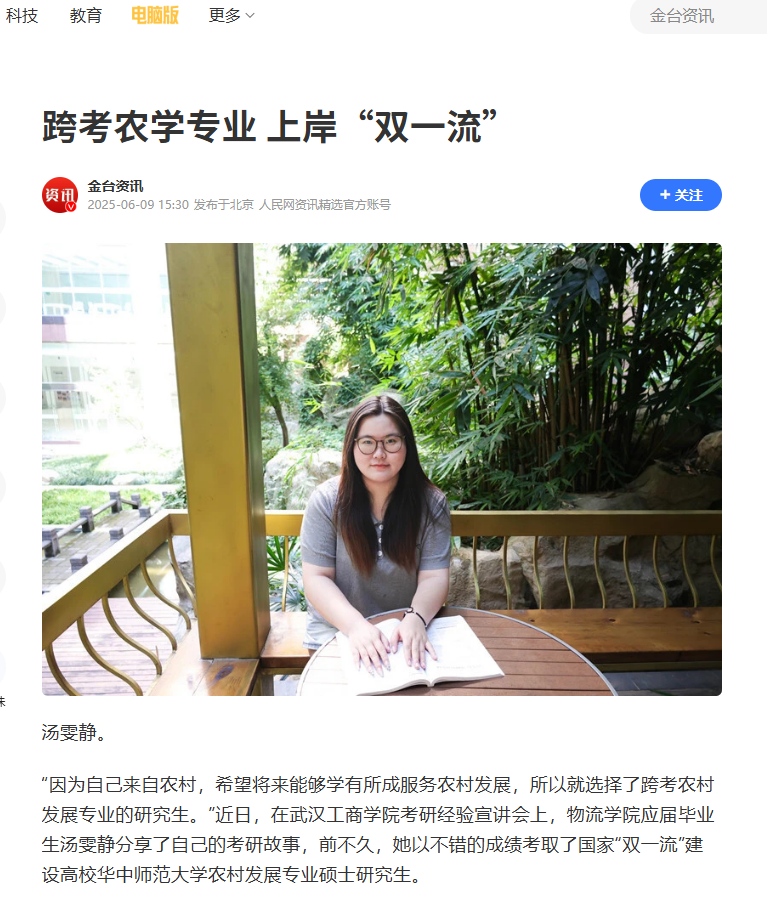 近日,米乐mile官方网站物流学院汤雯静凭借优异的成绩跨考农学专业 ,上岸华中师范大学,被人民网、腾讯网、网易、搜狐等多家媒体报道,报道新闻如下:
