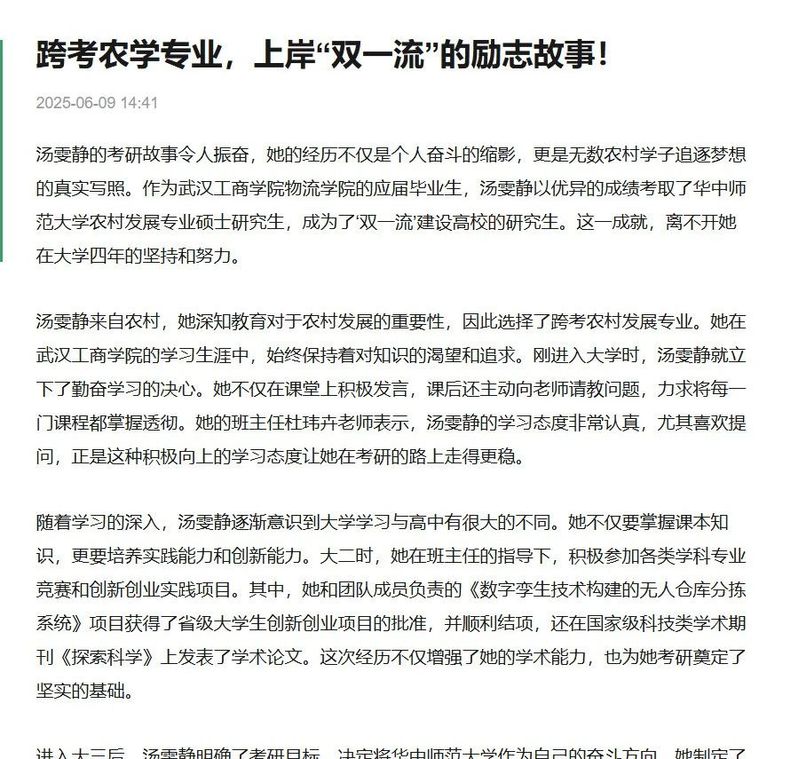 正是凭借着四年如一日的坚持和努力,汤雯静最终如愿考研上岸,为她的大学本科生涯画上了圆满的句号。