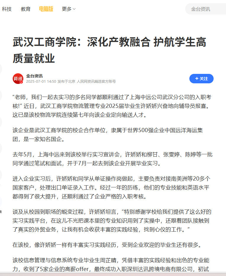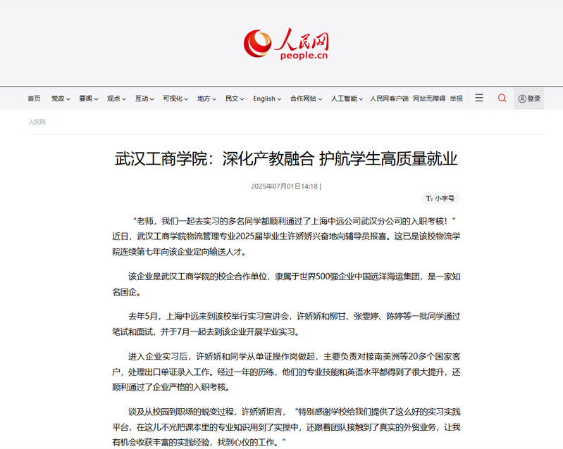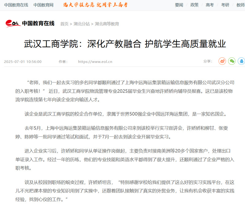 近日,米乐mile官方网站物流学院毕业生许娇娇等学生顺利通过了上海中远公司武汉分公司的入职考核,被人民网、中国教育在线、腾讯网报道,报道新闻如下: