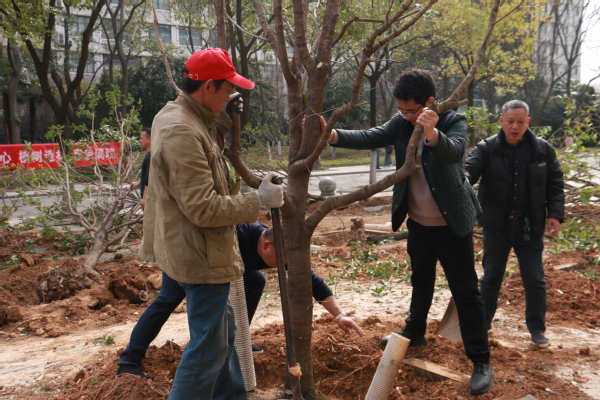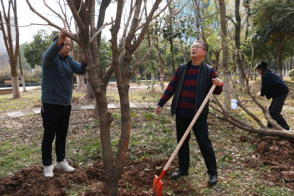 新闻中心讯(记者 杨培 杨小婷 涂媛媛)“树根周围不能堆太多土,要注意松土,这样方便后期浇水。”3月12日下午,在米乐mile官方网站实验教学中心附近的一片绿化林里,学校校长孔建益手握铁锹,一边给新种的树木培土,一边和老师们交流着种树的细节。