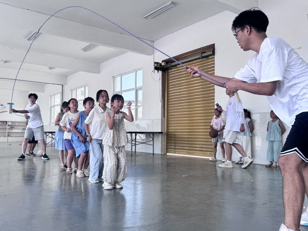 图为志愿者们为孩子上体育课