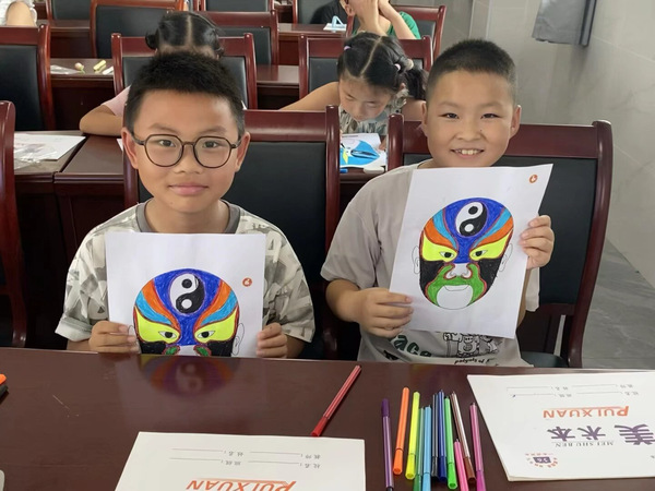 图为小朋友们展示自己画的作品