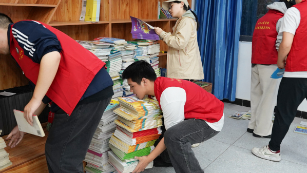 图为志愿者们正在对图书进行整理、编号 摄影:肖嘉禾