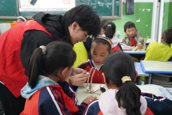 图为志愿者在科技课上在教孩子们动手实践 摄影:肖嘉禾