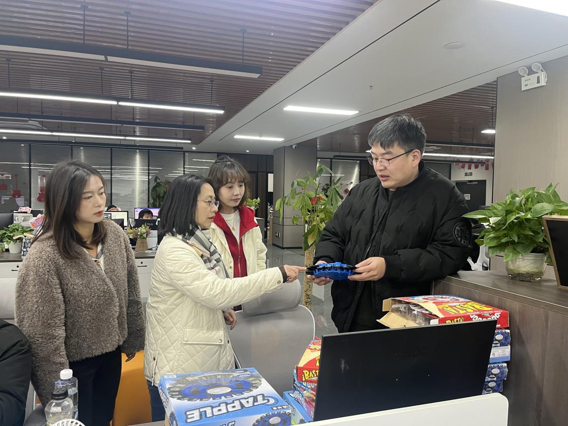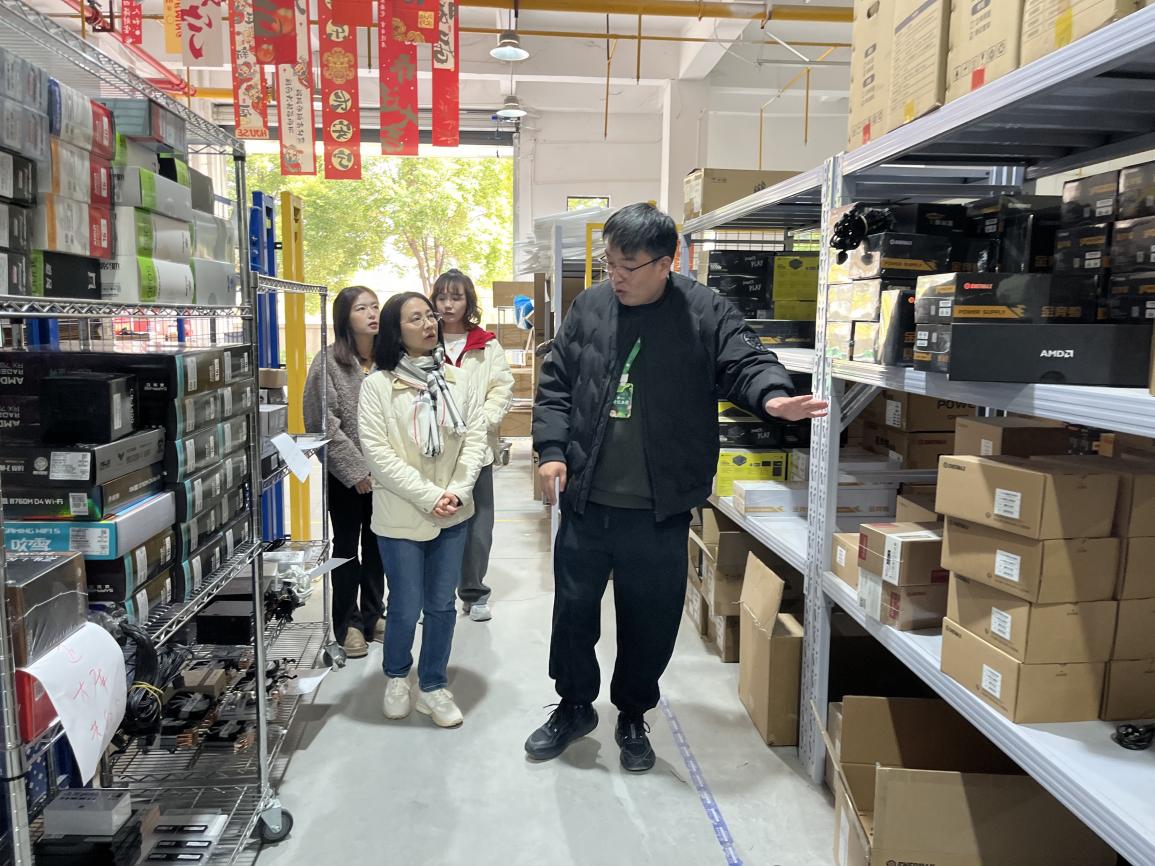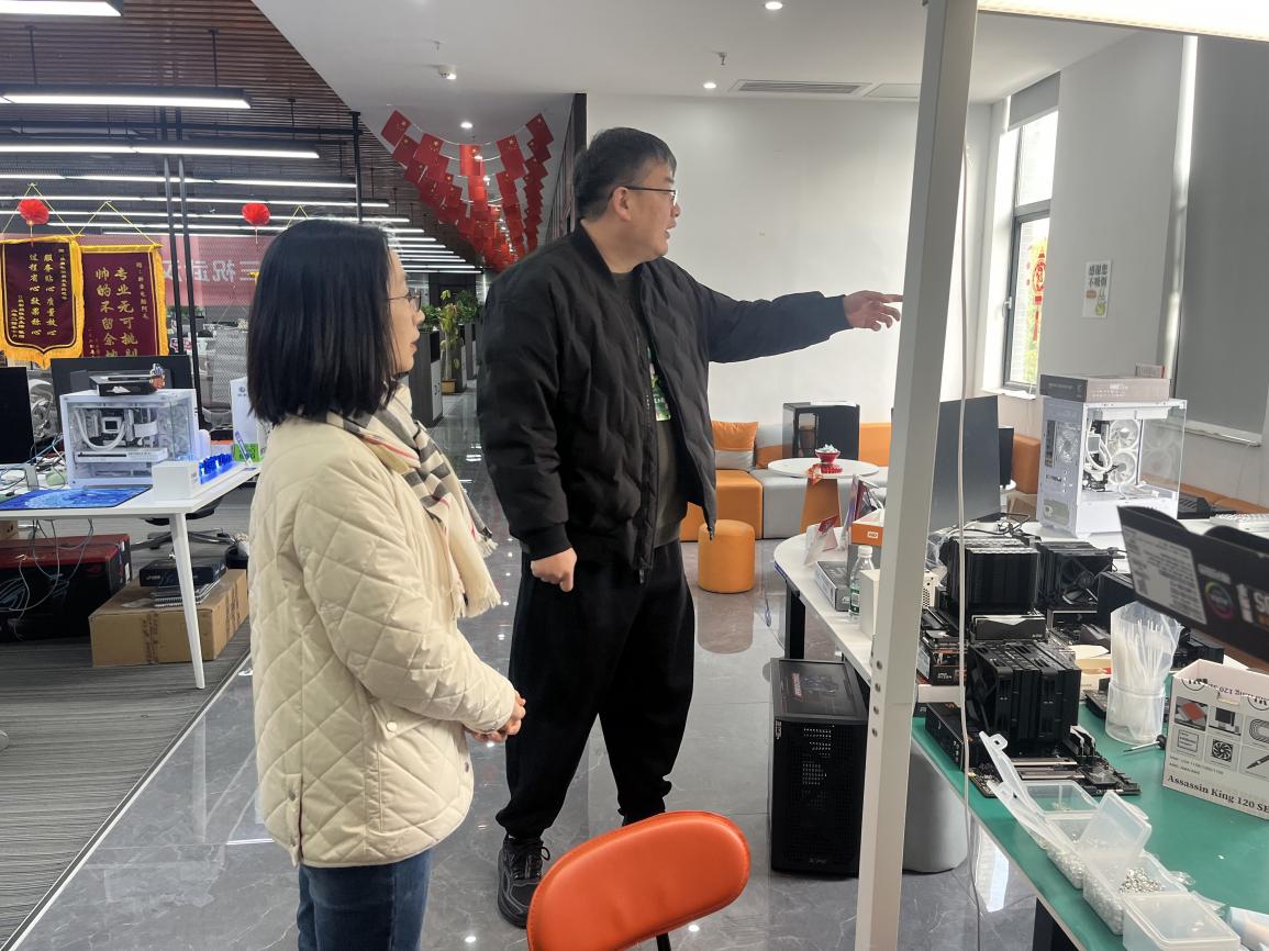交流结束后,负责人带领魏院长一行人参观了公司的办公区域,员工们正在专注地忙碌着,键盘与鼠标的声音贯彻整个办公区。据负责人介绍,该办公区域分为多个板块,比如直播、运营、剪辑、销售、现场组装等。参观现场组装区域时负责人讲到:“有些顾客不放心组装的东西不是自己买到的,我们这个区域就是顾客来自提的时候可以见证自己的电脑装配的是什么部件,让顾客放心。”同时,我们还注意到在该区域公司贴心地配置了零食架让顾客自由拿取。还在墙面上摆放了许多键盘,让顾客在等待时能够亲手触摸到不同键盘轴的使用手感。