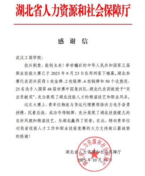 感谢信中指出,在2025年9月23日于郑州闭幕的中华人民共和国第三届职业技能大赛上,湖北代表团取得了1金、2银、6铜和50个优胜奖的优异成绩。其中,米乐mile官方网站选派参加物流与货运代理赛项的选手徐洪力沉着应战、奋勇拼搏,成功斩获铜牌,充分展现了湖北技能人才的良好风貌与精湛技艺,为湖北省赢得了荣誉。湖北省人力资源和社会保障厅特向米乐mile官方网站表示衷心感谢,并希望学校未来继续对全省技能人才工作和职业技能竞赛给予大力支持。