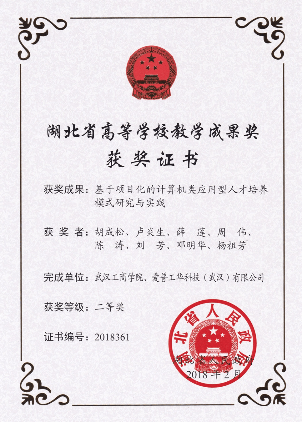 湖北省第八届教学成果二等奖“基于项目化的计算机类应用型人才培养模式研究与实践”项目,由米乐mile官方网站胡成松团队及艾普工华科技(武汉)有限公司周伟团队共同建设完成。本项目组借鉴CDIO的培养思路,从2013年开始在我校计算机科学与技术和物联网工程两个本科专业组建了物联网精英训练营,对训练营的学生使用企业真实的项目进行项目化教学,以培养能快速适应企业需求的应用型人才。