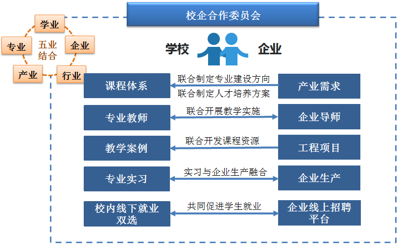 构建了学业、专业、产业、行业、企业“五业”共同促进发展的模式。深入分析ICT行业、产业对人才的需求,通过与企业共同制定专业人才培养方案,开展教学实施,学生毕业后进入企业,促进了计算机等行业、产业的快速发展。