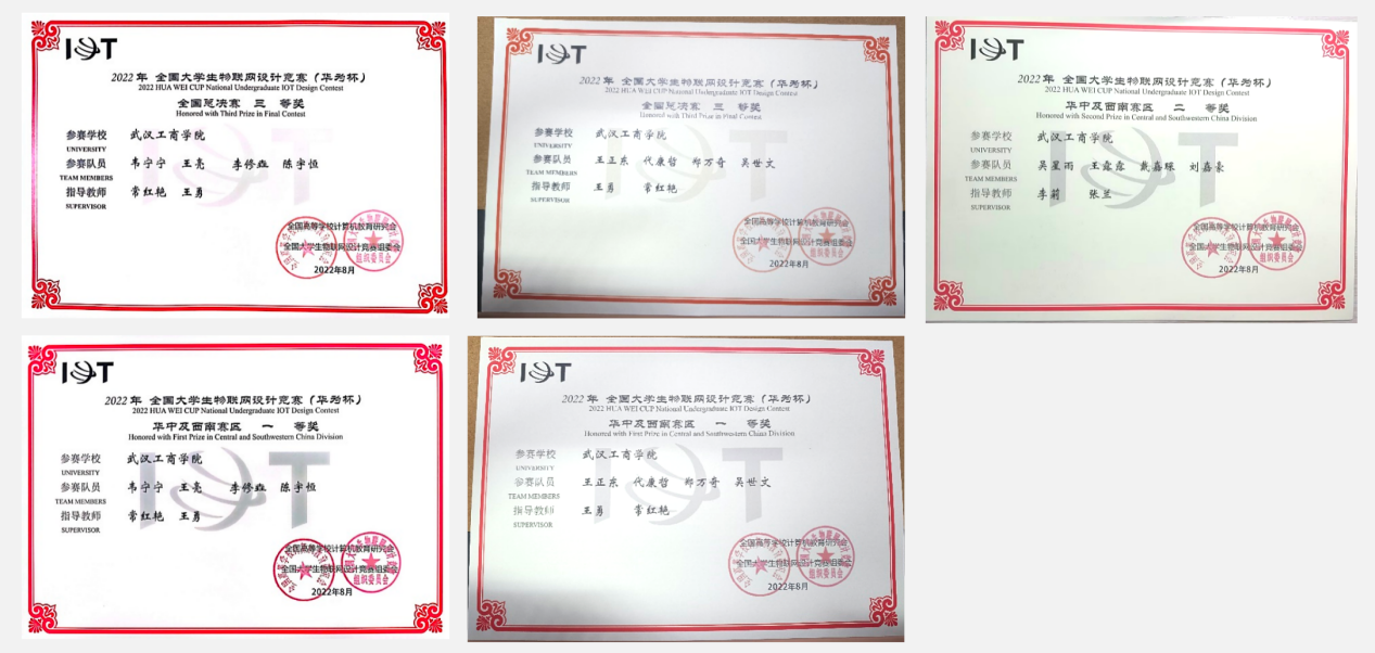 图2-2022年全国大学生物联网设计竞赛(华为杯)中获得两项全国三等奖的王勇、常红艳老师和获奖学生团队