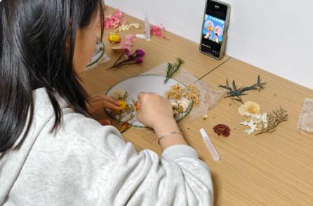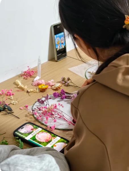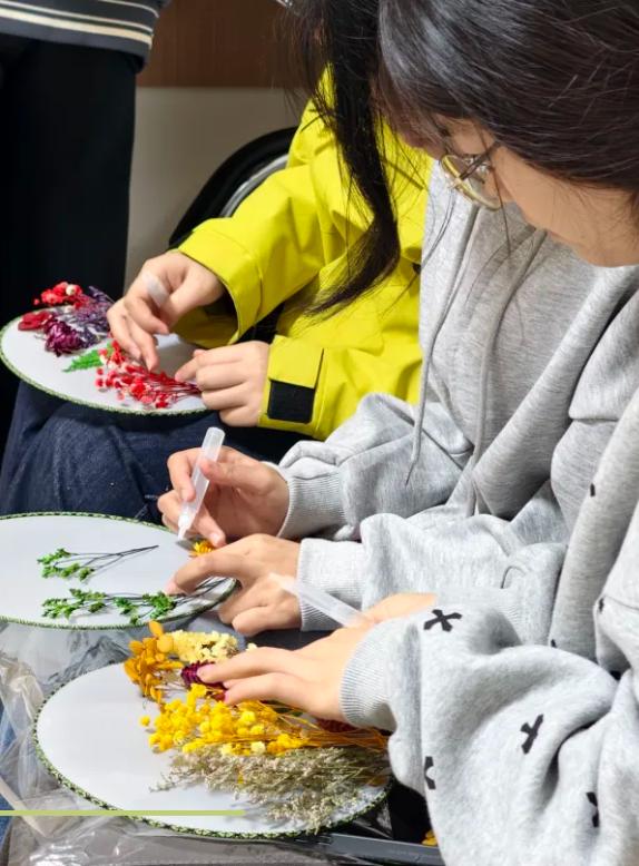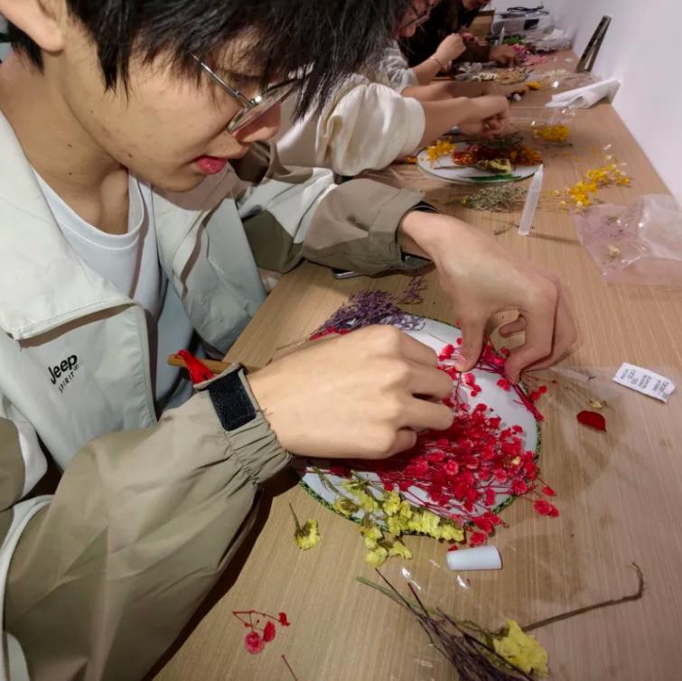 活动现场,空白团扇、色彩缤纷的永生花材专用胶水、镊子等工具整齐摆放,等待同学们的创意绽放。从构思构图到搭配花材,从 小心翼翼粘贴到调整细节,同学们沉浸在手作的乐趣中,用一双双巧手赋予素扇全新的生命