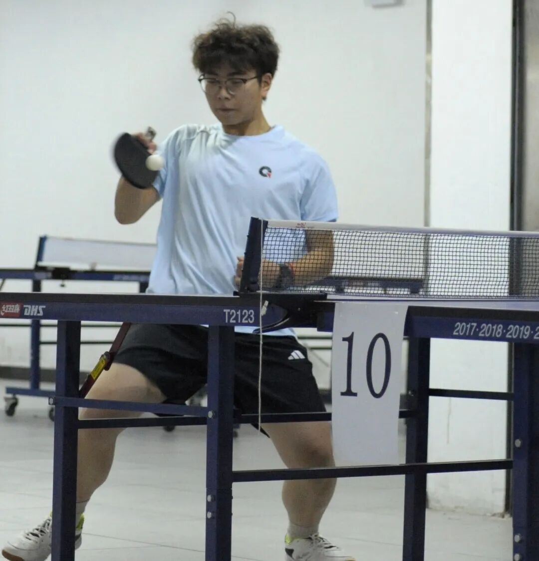 有的选手紧盯来球,身体如蓄势待发的弹簧,在球桌前上演 “凌波微步”;有的选手在赛点时刻屏息凝神,一记精准的落点让对手措手不及。场边观战的同学时而欢呼雀跃,时而屏息静气,把地下室变成了一片沸腾的乒乓乐园。