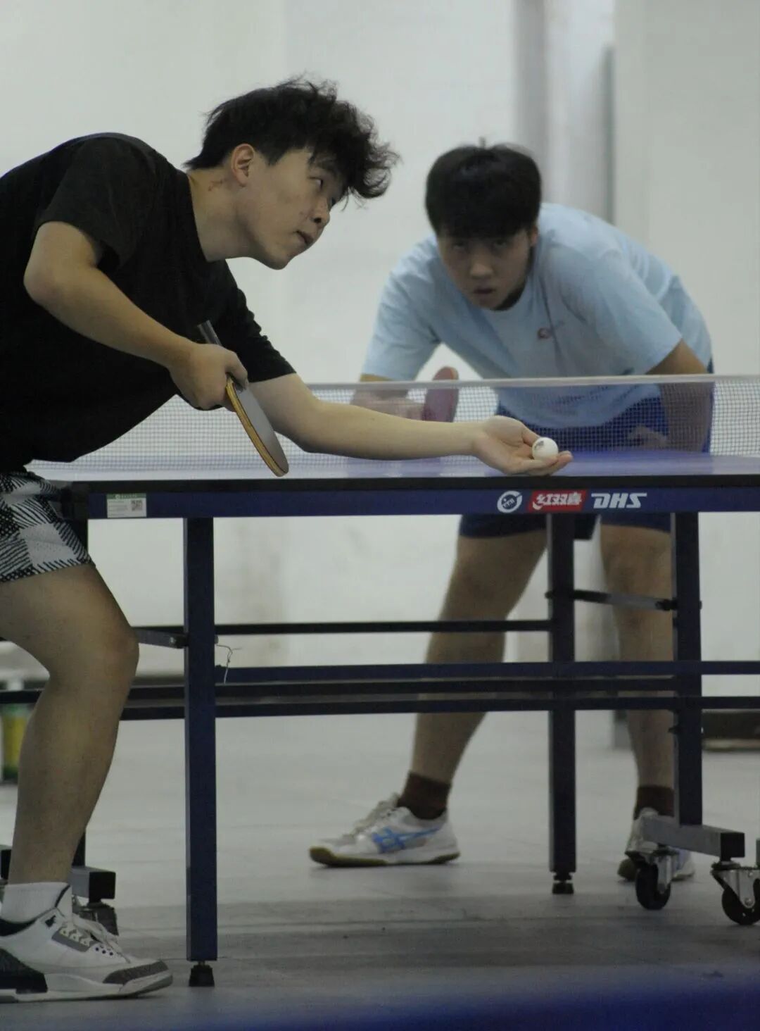 走进一食堂地下室,白色的立柱与专业的乒乓桌相映成趣。红双喜的球桌上,银球穿梭如闪电,选手们或俯身扣杀,或侧身提拉,每一个动作都凝聚着对乒乓的热爱与对胜利的执着。