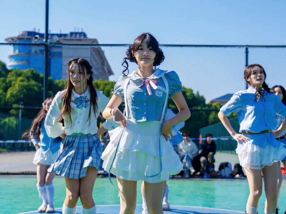 音乐响起,篮球宝贝们以整齐划一的动作、饱满热情的姿态舞动起来,她们的舞步轻盈灵动、活力十足,每一个转身、每一次跳跃都充满了青春气息,将现场气氛推向顶点。她们用自信的笑容、蓬勃的朝气和富有感染力的舞姿,为人工智能学院的球员们加油鼓劲,也为紧张激烈的比赛注入了别样的青春活力。一身浅蓝与白色交织的元气穿搭,篮球宝贝们在赛场边留下充满青春气息的合影。她们比出的爱心手势,是给球员们最甜的应援信号,也让赛场的热血里多了几分温柔的亮色。