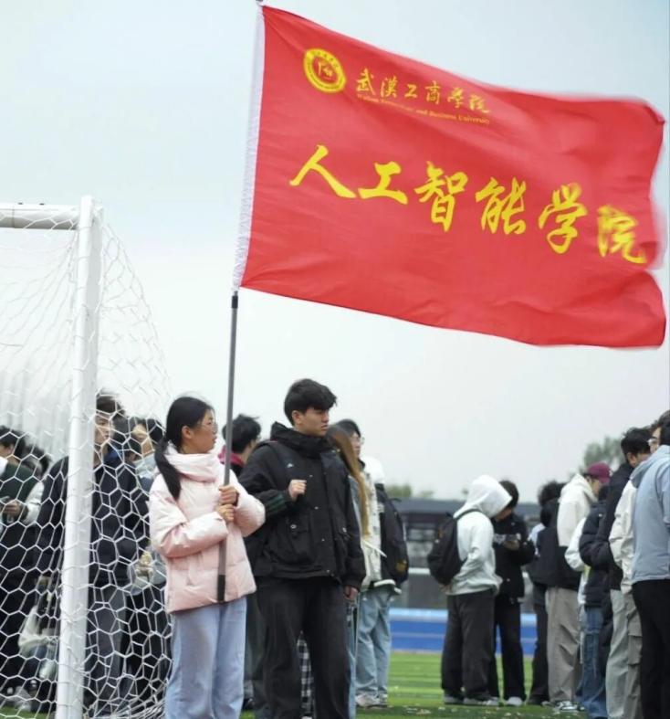 在队伍前方,一名学生高擎人工智能学院院旗,鲜艳的旗帜在寒风中猎猎作响。这面迎风招展的院旗,不仅代表着学院的荣誉与精神,更象征着每一位人工智能学子心中的理想与追求。院旗的每一次飘扬,都在诉说着"青春不畏寒"的坚定信念。