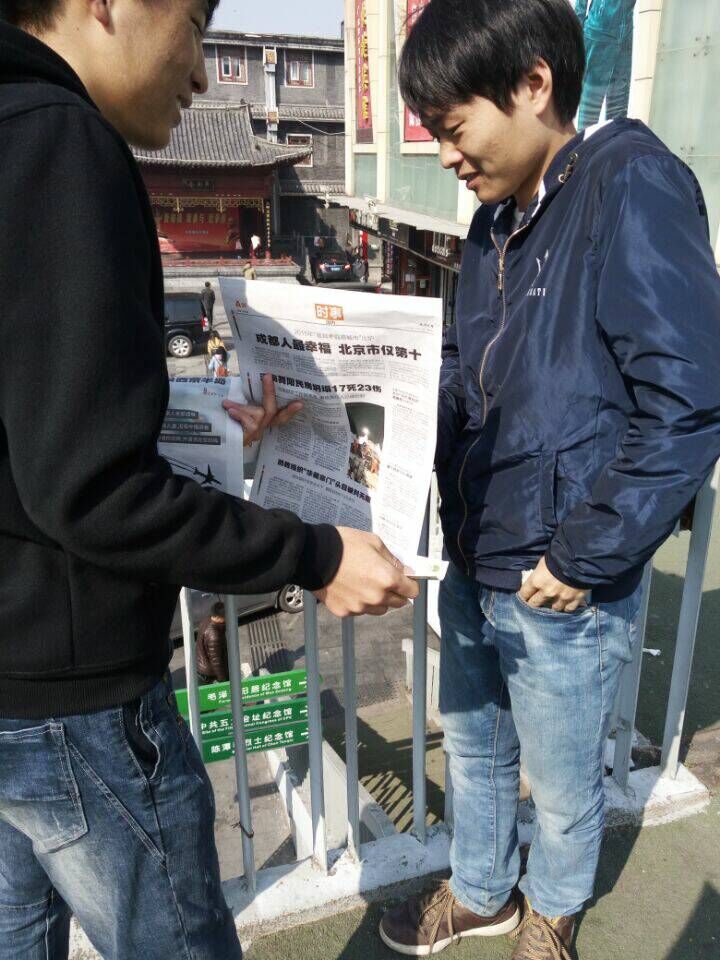 志愿者一共被分为15个组,各组分别有一名负责人,安排组内人员的具体工作,分组分地点走上街头进行义卖。 队员们手拿报纸在人来人往的街头中寻找适合的路人,微笑着走上前去耐心地为路人们店主们解释此次活动,希望他们能买下一份报纸,献出一份爱心,帮助罗金芳同学走出困难。