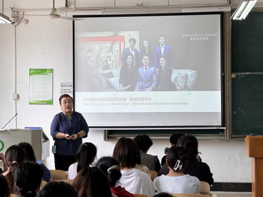 (通讯员:田真)2023年4月19日中午12:10在综合楼203教室,由应用技术学院举办的香格里拉资源共享服务(武汉)有限公司校园实习招聘宣讲会顺利召开,本次宣讲会邀请到香格里拉资源共享服务(武汉)有限公司人事经理刘迎星作为宣讲人,主要向21级会计专业实习生介绍了公司概况、招聘标准、公司自身优势,后聆听毕业生相关问题并耐心解答,至此香格里拉资源共享服务(武汉)有限公司实习宣讲会顺利结束。