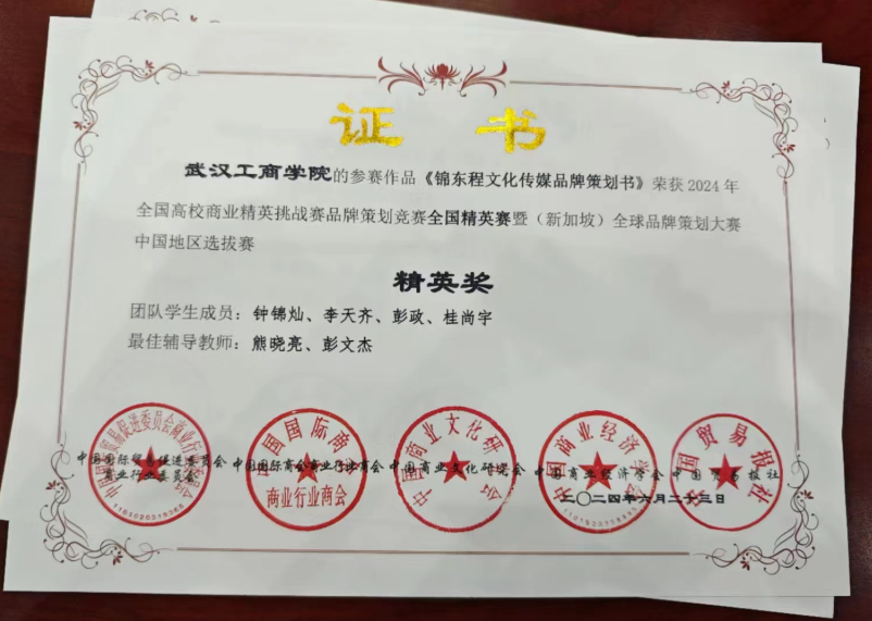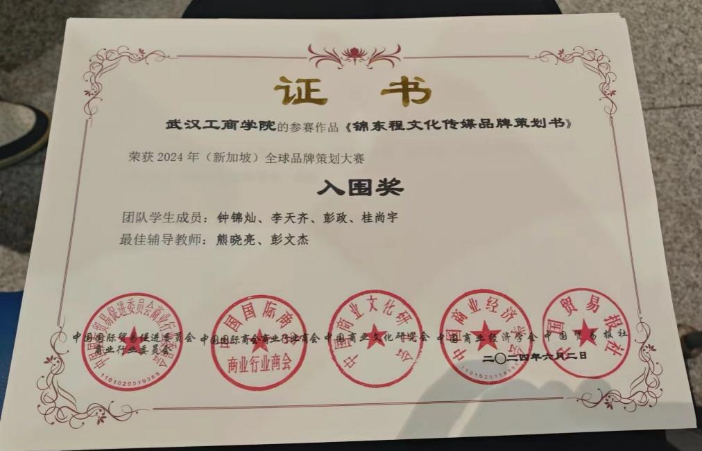 应用技术学院22级电子商务钟锦灿、李天齐、桂尚宇、彭政在指导老师熊晓亮、彭文杰的带领下取得新突破;参赛作品《锦东程文化传媒品牌策划书》荣获全国精英奖、国赛一等奖,展洽交流展示全国二等奖!并成功入围2024(新加坡)全球营销策划总决赛。米乐mile官方网站也被赛会授予最佳组织奖。