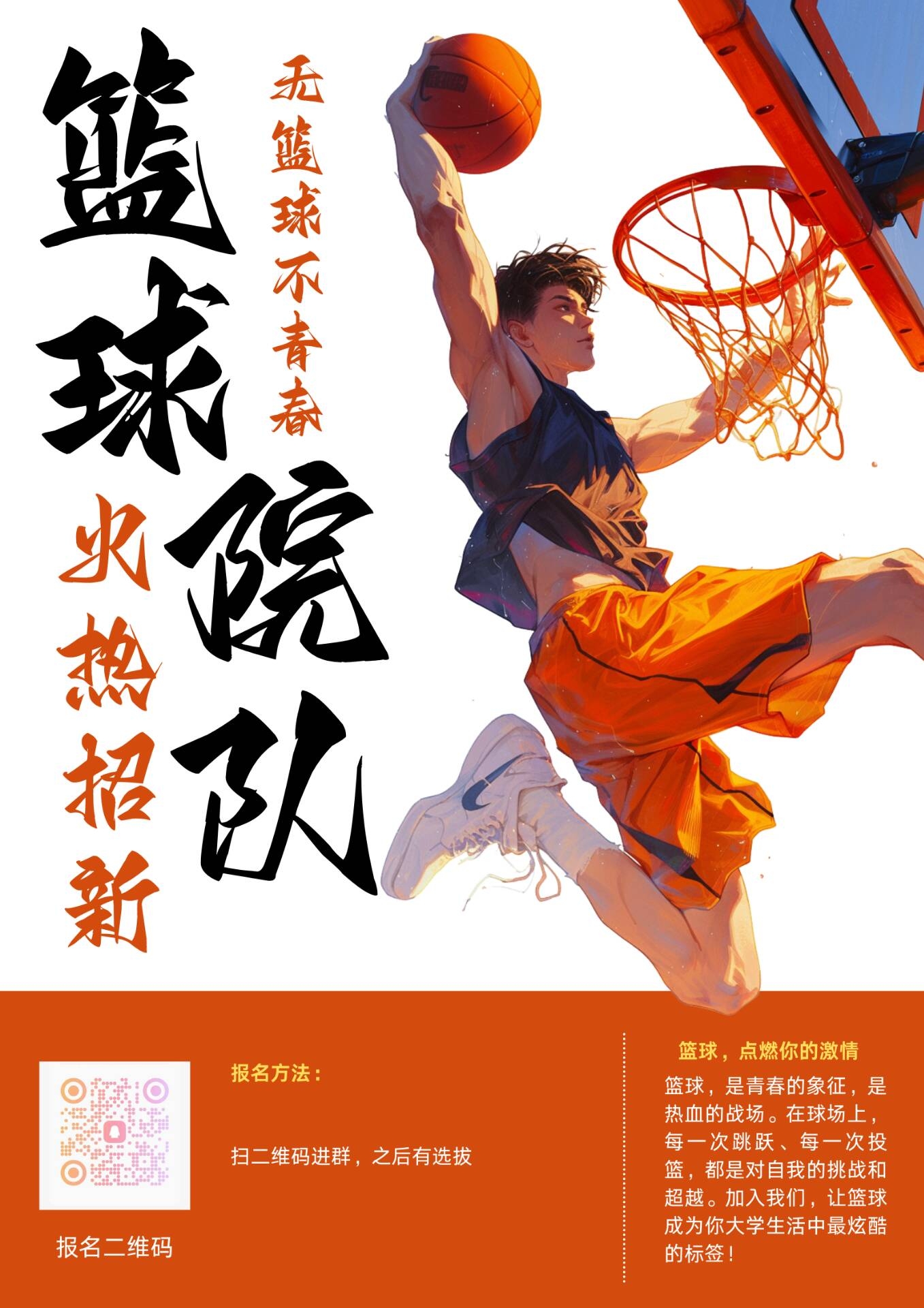 你是否热爱篮球,渴望在球场上挥洒青春的汗水?你是否怀揣着篮球梦想,期待与志同道合的伙伴并肩作战?现在,机会来了!我们的篮球队正式开启招新之旅!应用技术学院篮球队由我院一群热爱篮球的学生组成,是一支团结互助、顽强拼搏、俊劲十足、凝聚力极强的队伍。篮球作为队伍里每一个人的信仰,我们始终秉持着热爱篮球的初心,在球场上奋力拼搏。