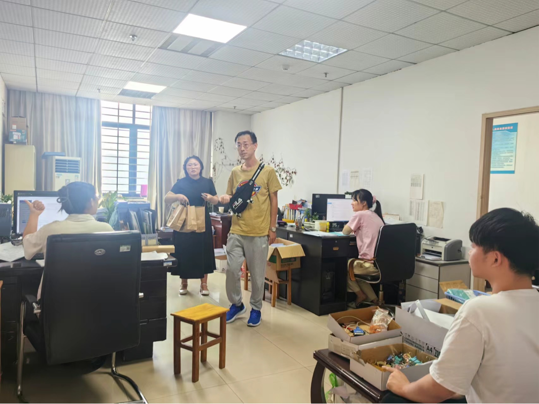 2024年9月14日,在这个秋意渐浓的日子里,应用技术学院党委书记朱威携同22级毕业班辅导员田真、李梦洁、柳燕、周心怡、李娟等一行老师,带着学院的深切关怀和精心准备的慰问品,走访慰问了正在校内各行政部门进行集中实习的学生们。