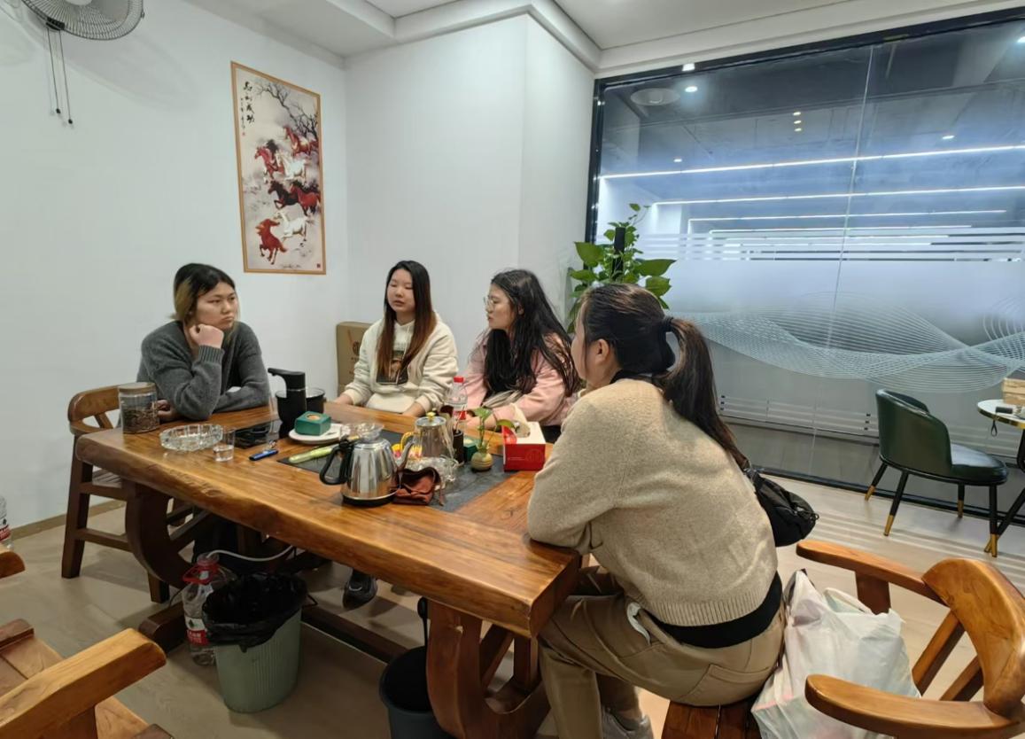 在公司负责人陪同下,应用技术学院老师们首先参观了公司的办公区域和直播间,详细了解了学生们的工作环境。随后,老师们与实习的四位学生——张暄、熊颖、魏思雨和刘希唯进行了亲切的交流。