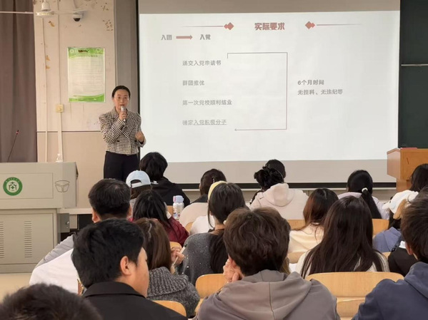 课堂上,田真老师结合《中国共产主义青年团章程》核心内容,从理论学习、实际要求、特色实践三个维度展开讲解。她重点阐释了共青团作为党的助手和后备军的性质定位,详解党对共青团政治、思想、组织三方面领导的核心要义,带领学员深入学习党的二十大精神及“两个确立” 的决定性意义。同时,田老师围绕入团入党流程、思想汇报撰写、理论学习要求等实际问题,为学员们理清成长路径,鼓励大家以无挂科、无违纪的优良表现,积极向党组织靠拢。